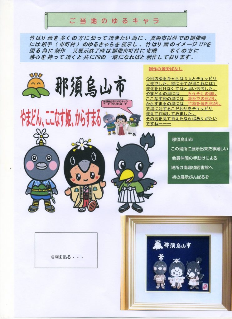 竹張りがを多くの方に知って頂きたいために、真岡市以外での開催時には相手(市町村)のゆるキャラを展示し、竹はり画のイメージUPを図るために制作、又、展示終了時には開催市町村に寄贈